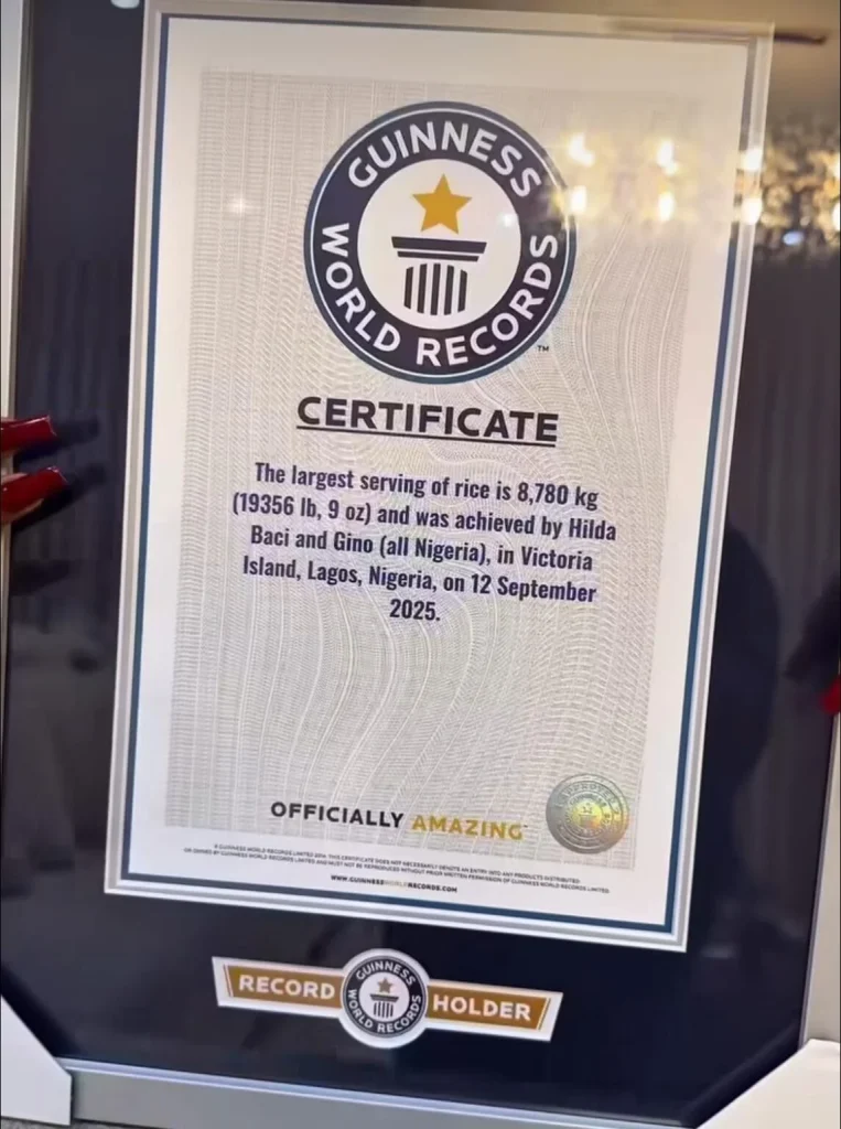 Hilda Baci, a popular Nigerian chef, has received her third Guinness World Record certificate plaque, solidifying her position as a three-time record holder. This latest recognition stems from her record-breaking feat of preparing the largest serving of Nigerian-style jollof rice in 2025, which also set the record for the largest serving of rice overall.