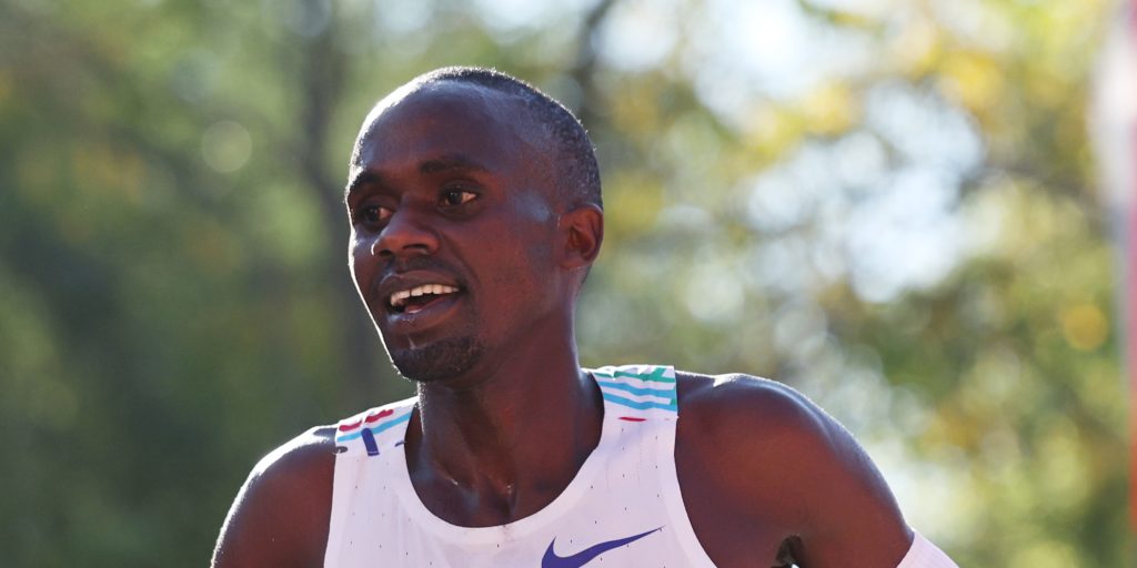 CHICAGO, ILLINOIS – OCTOBER 12: Jacob Kiplimo of Uganda celebrates his 2025 Bank of America Chicago Marathon win with a time of 02:02:23 on October 12, 2025 in Chicago, Illinois. (Photo by Geoff Stellfox/Getty Images)